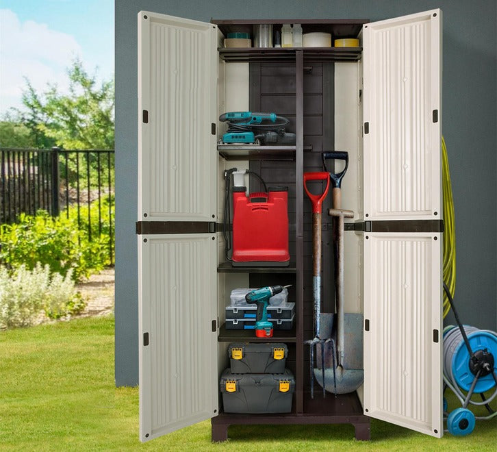 The cabinet features large vertical storage, adjustable shelves, and deep internal capacity — perfect for large tools, sports gear, pool equipment, and household items. It’s designed to maximise space without taking over your backyard.