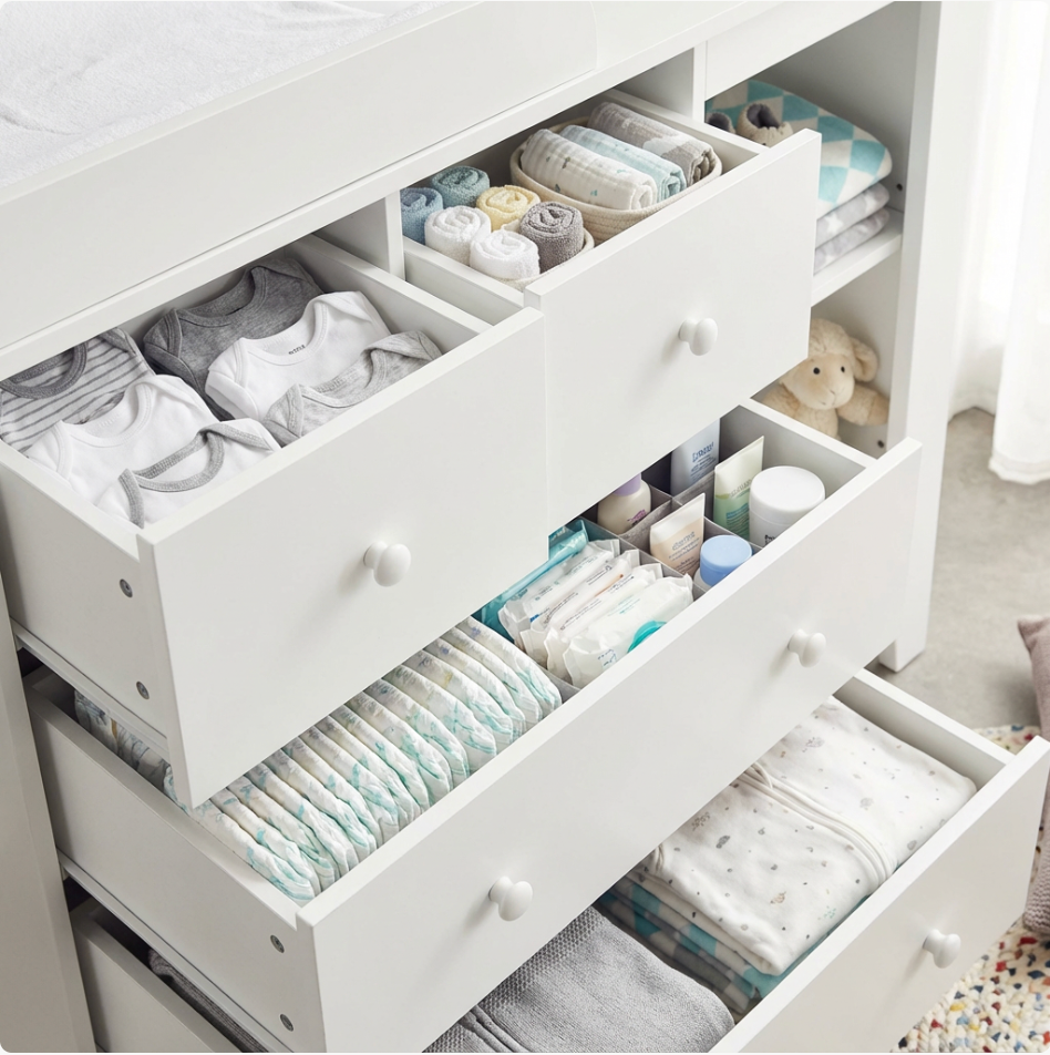 You get multiple organised tiers plus extra side compartments for wipes, nappies, creams, clothes, toys, and more—keeping everything within arm’s reach for faster, calmer changing sessions.