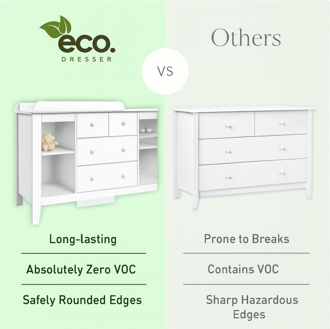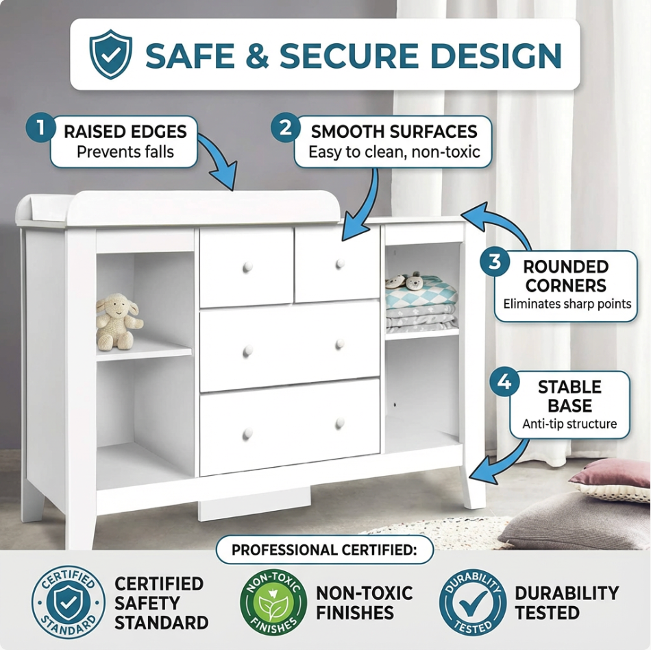 Every Eco Toppers™ Baby Change Table is engineered with reinforced stability, anti-tilt support, and a secure raised-edge changing surface to keep your baby safe during every change. The durable, non-toxic materials ensure long-lasting performance and peace of mind—day after day, year after year.