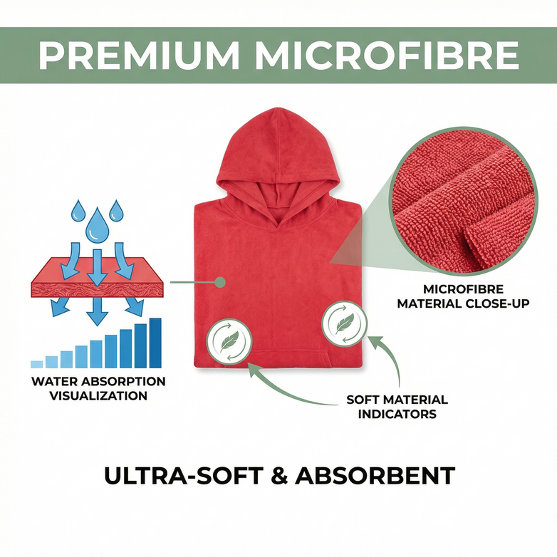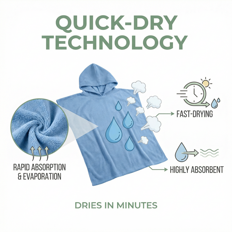 Feel the difference immediately with superior quick-dry microfibre that dries in minutes, not hours. Our hands-free poncho design provides warmth, coverage, and convenience at the beach, pool, or while traveling.