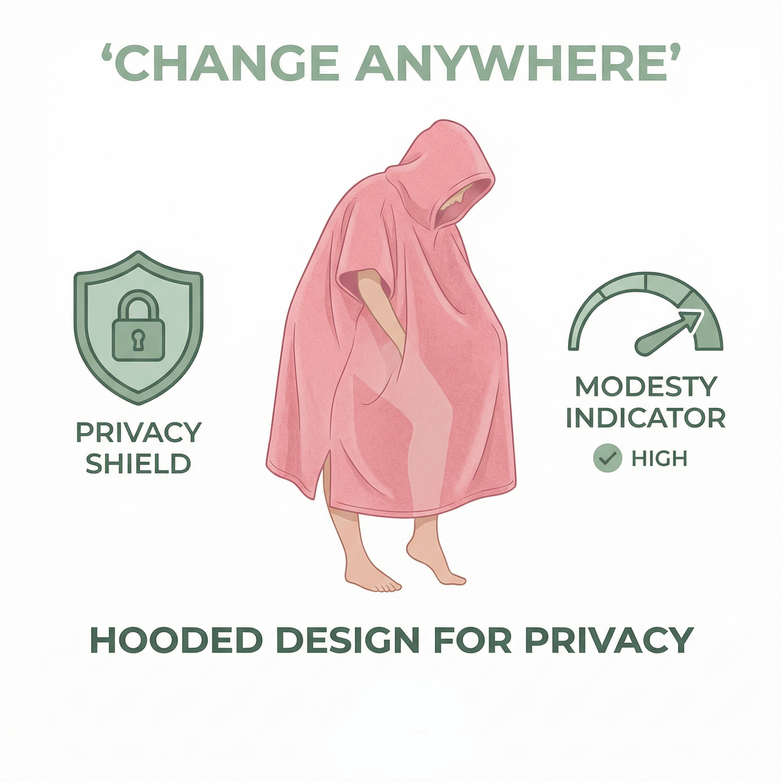 Absolutely. Our full-coverage poncho design wraps completely around your body, providing total privacy from all angles. Unlike regular towels that slip and expose you, our premium design stays securely in place with generous 110cm x 88cm sizing. The hood provides additional coverage so you can change confidently at crowded beaches without worry.