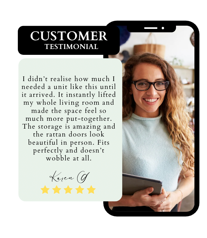 This unit completely transformed my living room. The real rattan doors, smooth finish, and solid wood legs make it look premium, and the storage is incredible. Everything finally has a place — no clutter, no mess, just a stylish, organised space I’m proud of.